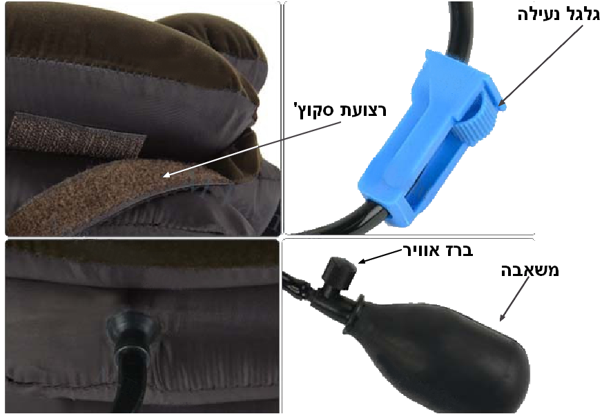 (העזר בתמונה משמאל) 1. הנח את הכרית על הצוואר כאשר ידית הניפוח מימין כשהפתח פונה לחזית . 2. סגור את רצועות הסקוץ'. 3. וודא שברז שיחרור האוויר במצב סגור. 4. נפח את הכרית בעזרת המשאבה עד שהנך מרגיש לחץ קל. 5. נעל את צינור האוויר עם גלגל הנעילה הכחול. 6. בסיום, פתח את גלגל הנעילה ואת ברז האוויר.